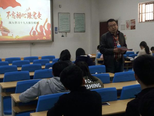 孙小龙着重介绍了十九大报告的主题和主要内容,对报告中“新时代”、“新思想”、“新矛盾”、“新目标”四个新概念进行了详细解读。他要求:作为新时代的大学生应具备敏锐的政治判断力、强烈的使命感和责任感;要率先垂范、深入学习,增强“四个自信”;培育和践行社会主义核心价值观,坚持党的教育方针,立德树人;要狠下功夫、深钻理论,与时俱进地学习,让自己的思想、行为与党中央保持一致,将十九大精神及时融入自身政治学习中。