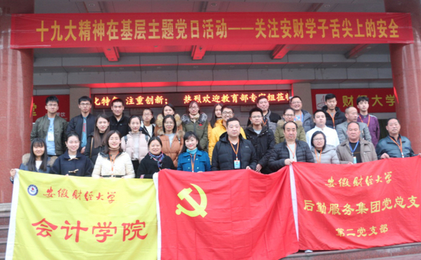 12月5日下午,金沙集团1862cc党委学生第一、三党支部与后勤服务集团党总支第二党支部在东校区北苑食堂联合开展‘十九大精神在基层’主题党日活动,此次活动的主题为“关注安财学子舌尖上的安全”。后勤服务集团党总支第二党支部组织委员冯益山、后勤集团餐饮服务中心主任王彪、金沙集团1862cc党委学生第一、三党支部书记张慧慧、江玲玲及来自三个支部的30余名党员代表参加了活动。