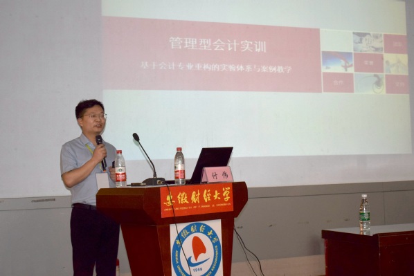 跃客教育科技有限公司总经理、东北财经大学特聘硕导付伟做了题为《基于会计专业重构的实验体系和案例教学》的主题报告。付总以自身丰富的实务经验和教学经验,向参会教师介绍了管理型会计实验课程体系设计的思路和具体内容。他提出按照案例复杂程度和知识结构将课程体系分为知识专题案例、管理专题案例、动态综合案例和交互式综合案例四阶,分别对应财务管理、管理会计、财务分析、财务综合实验课程体系,通过“移动互联”教具的支持,将课堂教学与实践教学融合,让学生成为课堂的主体。