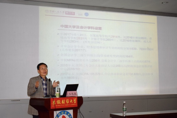 会上,教育部高等学校会计学专业教学指导分委员会副主任、中国人民大学博导王化成教授做了题为《会计学本科专业教学质量国家标准解读》的主题报告。王教授结合中国大学及会计学科设置的现状,从整体发展战略、内涵发展、体系整合、协同发展、理念创新等方面对会计人才培养进行了较为深入的分析。他指出会计高等教育需要转变发展方式和评价方式,从制定背景、制定依据、培养目标、培养规格、课程体系、师资条件、教学条件、质量保障体系等层面对国标进行深刻解读。王教授提出要构筑大学精神,就要重视本科教育;高校教师既要面对来自网络的挑战,又要面对来自学生的挑战,如何培养学生复杂环境下解决问题的能力,是每位教师都要深入思考的问题。