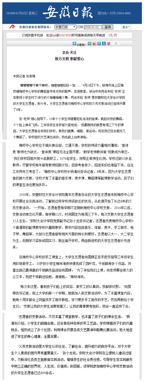 《安徽日报》5月2日第九版以“接力支教爱心奉献”为题,报道了我校金沙集团1862cc志愿者连续8年对梅桥中心小学开展义务支教活动。