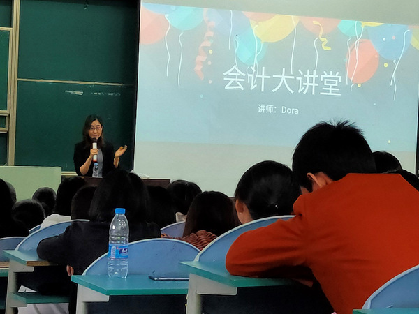 活动伊始,由英国布里斯托大学毕业的优秀硕士生,有着在普华永道十余年的审计工作经验,长年从事大型银行、私募基金的上市工作的Dora老师进行演讲。首先,她简要介绍了自己的学习和工作经历,并讲述了会计的定义和具体工作以及一名会计人应有的准则等等,让同学们受益匪浅,最后老师针对未来规划和考证等同学关心的话题,给出合理的建议。