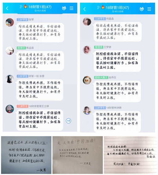 2月8日,班委通过电话向班级同学询问身体是否健康,家中有没有口罩等问题,也祝大家健康平安。与此同时,团支部也在筹备班级微信公众号的抗疫文章——居家抗疫第一弹,并向班级同学征集疫情期间居家活动。辅导员在班级群聊中经常宣传疫情防护手册,增强大家抗疫决心。