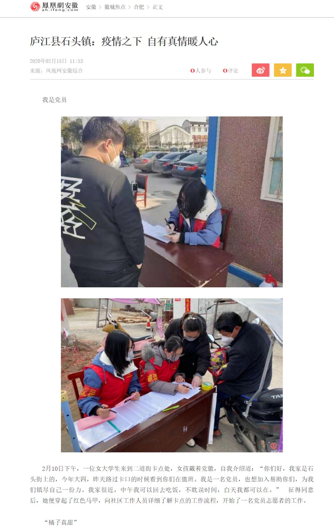 当下正是疫情防控的关键时期,自2月9日合肥市庐江县石头镇实行交通管制以来,全镇22处交通卡点,每天由志愿者们轮流值班值守。付志雅同学得知此事,在征得父母同意后主动报名疫情防控志愿服务。她说:“作为一名预备党员,我理应响应号召。”寥寥数语,却很好的凸显了我院学子牢记使命,一心为国的责任与担当。