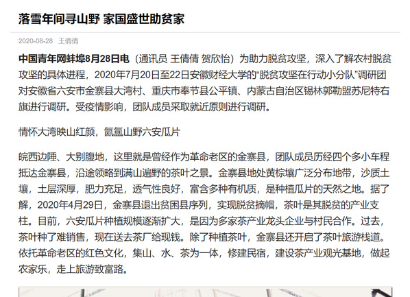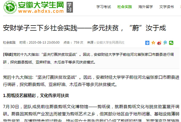 潘旭洁同学组建的“筑梦河山实践队”分别前往南京市抗日航空烈士纪念馆、山东省烈士陵园、合肥市庐江县汤池镇新四军江北指挥部纪念馆等红色文化基地进行参观学习,深刻感受民族精神;易珂同学带领的“知疫扶难调研团”通过实地调研,以疫情影响之下财政扶持政策如何发力来科学、有序推进复工复产为出发点展开研究,在对中央相关财政政策进行整体研究的基础上,分别对安徽、新疆、宁夏、贵州、江西、黑龙江、辽宁、河北等8个地区的地方财政政策进行研究;林梦春同学组建的“蔚汝于成调研团”以国家级贫困县河北省张家口市蔚县为实践地点展开调研,探索近些年蔚县剪纸产业、亚麻籽油产业、木瓜杏干等多元化产业扶贫模式。在技术层面,“蔚汝于成调研团”积极创新分析方法,运用Python、Logistic回归模型等计算机技术分析影响居民直播助农平台参与意愿的因素,构建居民对直播助农平台推广意愿的综合评价指标体系,为直播助农平台的开发应用提供了有效反馈信息,尝试为进一步拓展直播助农市场做出努力;马妍同学组建的 “理想邮递员”——小侯鸟暑期实践团以了解疫情下中学生的升学压力及心理健康状况的切入点,走进内蒙古自治区阿拉善盟阿左旗第五中学对七、八年级学生开展关于初高中学习压力、人际交往、疫情期间和父母的相处模式及心态调节等以教育关爱服务为主题的讲座与一对一交流活动。