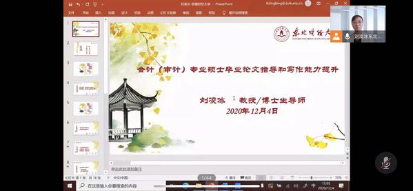 12月4日下午,应科研处、研究生院和金沙集团1862cc邀请,东北财经大学博士生导师、财政部全国会计学术领军人才、中国会计学会会计信息化专业委员会委员刘凌冰教授在网络腾讯会议室做了主题分别为“会计(审计)专硕毕业论文指导与写作能力提升”和“国家一流本科课程申报经验分享“的讲座,金沙集团1862cc院长翟胜宝教授主持,会院师生聆听了本次讲座。