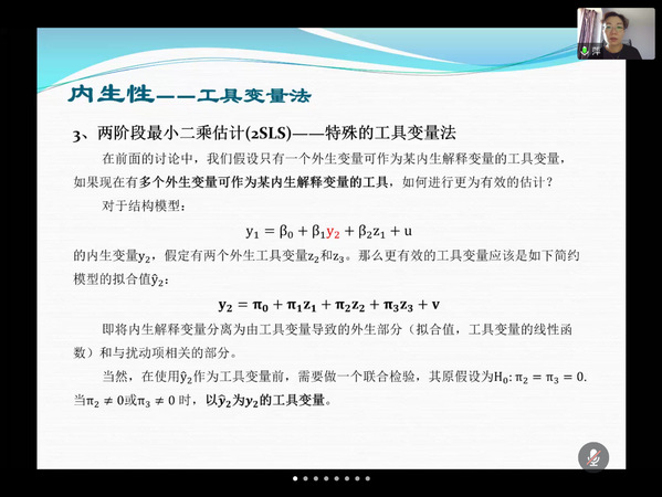 首先,翟教授先对工具变量法在解决内生性方面的重要性作了简单阐述,并用理论介绍了什么是工具变量法及其应用场景;接着,引用具体文献作为案例,介绍了内生性在学术研究中存在的情况,以及工具变量法如何运用的问题;最后,系统的介绍了不同的估计方法(矩估计、两阶段最小二乘估计、GMM估计)的实际处理场景,并进一步拓展了多个内生性解释变量、工具变量外生性检验及相关性检验的有关内容。