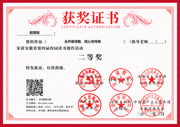 近日,由中共安徽省委教育工委、省教育厅、省人力资源和社会保障厅、省文化和旅游厅、省新闻出版局、共青团安徽省委员会等部门联合举办的第四届“校园读书创作活动”评选结果公布,我院19级会计1班赵璐瑶同学的作品《云开雾将散,同心待月明》荣获二等奖。