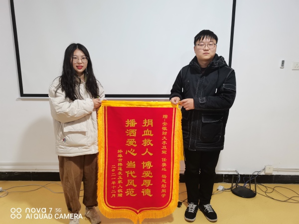 近日,一条锦旗送到了金沙集团1862cc辅导员办公室,令大家非常诧异,在详细询问之后才知道原来是经济学院2021级同学李双辉,金沙集团1862cc2020级任奕远和杨思彤两名同学在11月初成功为一名白血病患者捐献血小板,为挽救他人生命贡献了自己的青春力量。