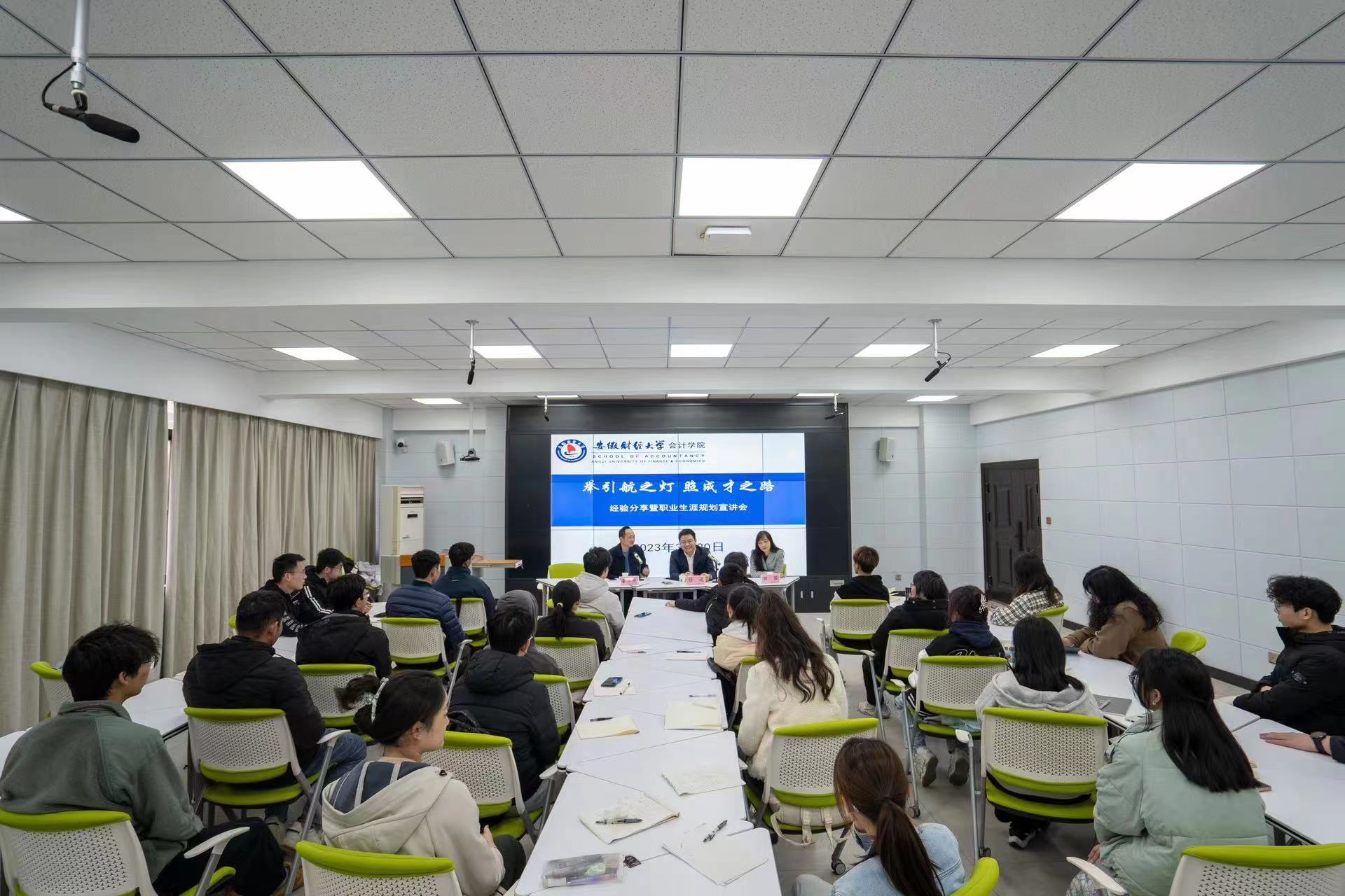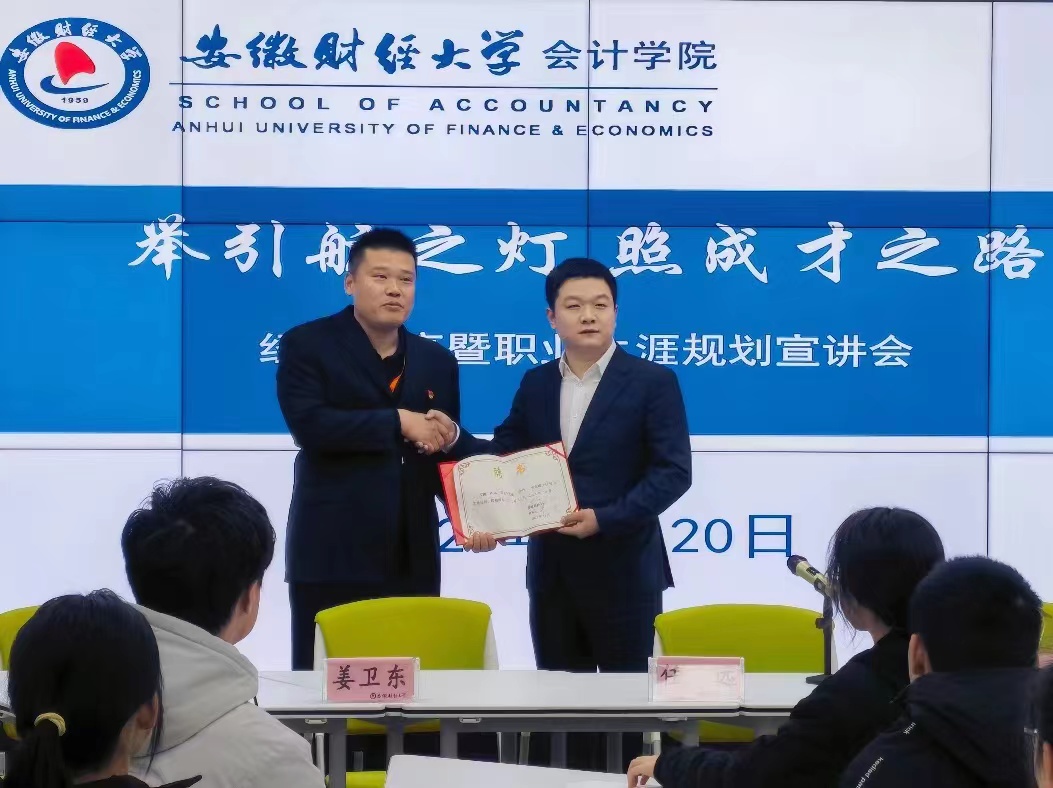 3月20日下午,金沙集团1862cc在东校区明德楼323教室举办了主题为“举引航之灯,照成才之路”职业生涯规划及优秀校友经验分享会。此次分享会特别邀请金沙集团1862cc2010级本科优秀校友、润泽智算科技集团股份有限公司财务总监任远先生,普丽盛包装材料有限公司董事姜卫东先生与金沙集团1862cc学生共话成长、共谋发展。金沙集团1862cc党委书记谢德刚出席活动并为任远颁发金沙集团1862cc会计专业硕士实践导师聘书。会议由金沙集团1862cc国际会计系主任田园副教授主持。