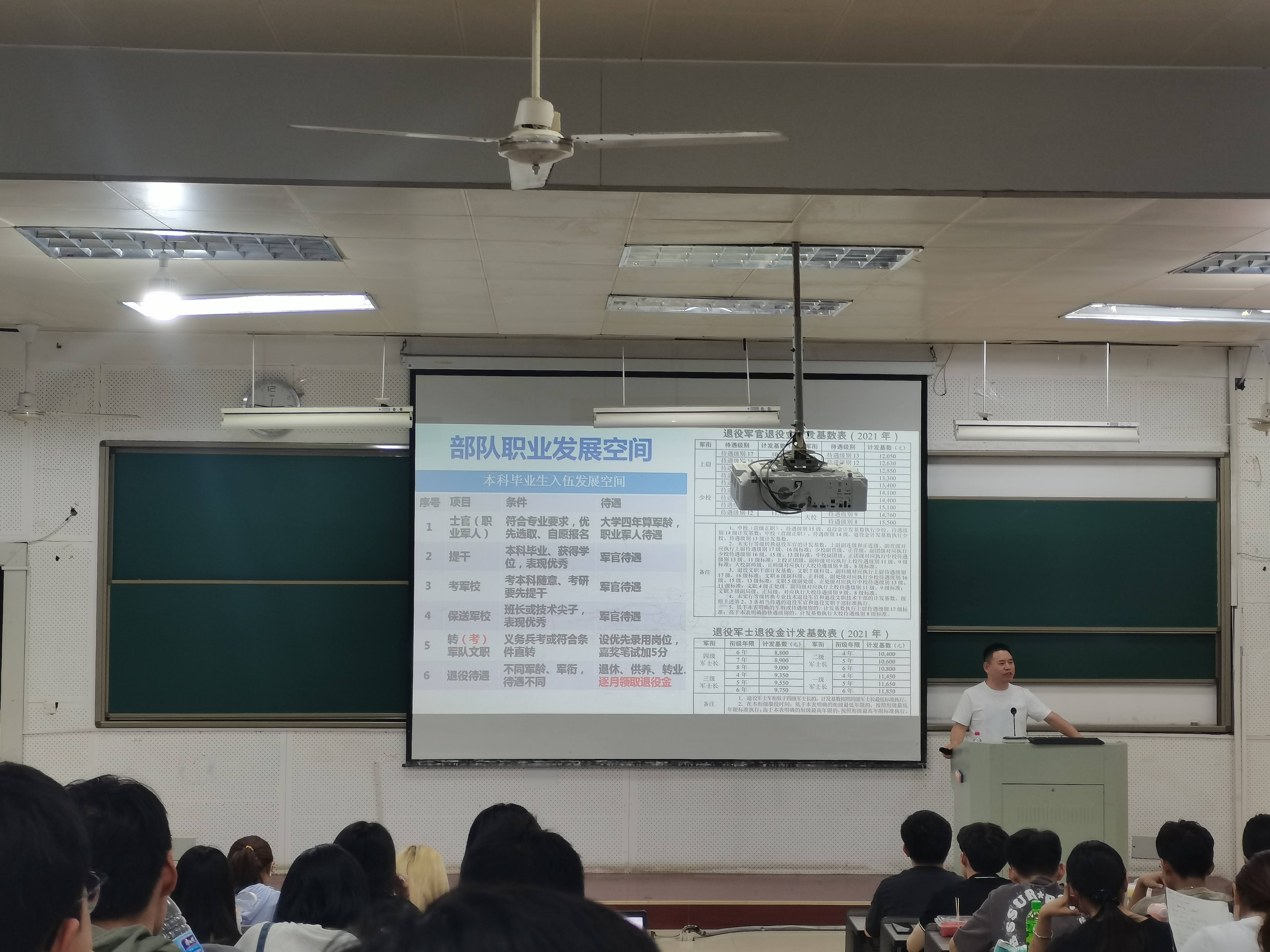 张剑老师以“读书是为了什么”开启征兵动员宣讲,他从征兵入伍的发展前景、报名条件、报名时间、报名流程和优惠政策等方面进行了详细解读。随后,张瑾老师分享了目前考研形势、院校专业选择以及招生调剂的相关政策,他建议同学们合理选择报考院校并科学高效地复习备考。最后,石怀旺老师介绍了出国留学的相关项目,他详细讲解了出国留学的优势和国外名校硕士生申请的具体要求,表示学院会积极为大家出国、考研等就业服务提供精细化服务。